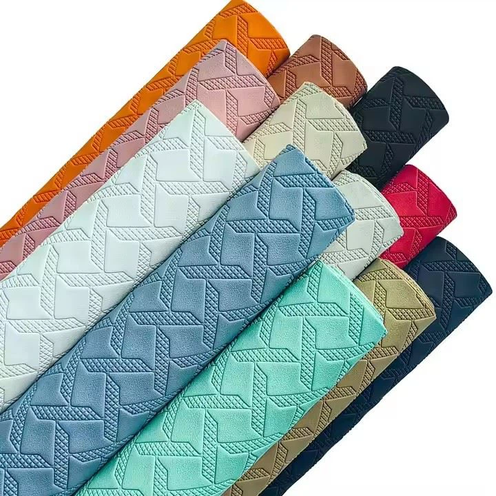 - O couro falso em relevo em cores sólidas é um material sintético que se parece com couro de verdade. Possui uma superfície suave e polida que lhe dá uma aparência luxuosa. O padrão de tecido em relevo acrescenta um toque de sofisticação e elegância ao material, tornando -o uma escolha popular para designers de moda e consumidores.