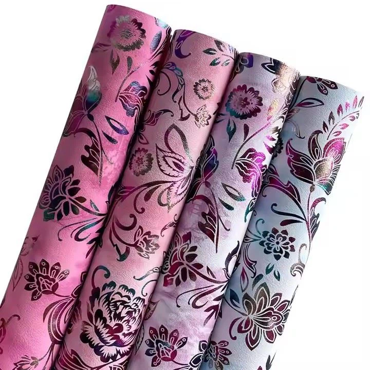 - O tecido de couro sintético de couro falso a laser de alta qualidade é um material versátil e bonito que traz um toque de luxo e glamour a qualquer projeto. Este tecido é perfeito para criar peças de moda impressionantes, acessórios ou itens de decoração da casa. O design de flores de corte a laser adiciona um detalhe único e intrincado que eleva a aparência geral do tecido.